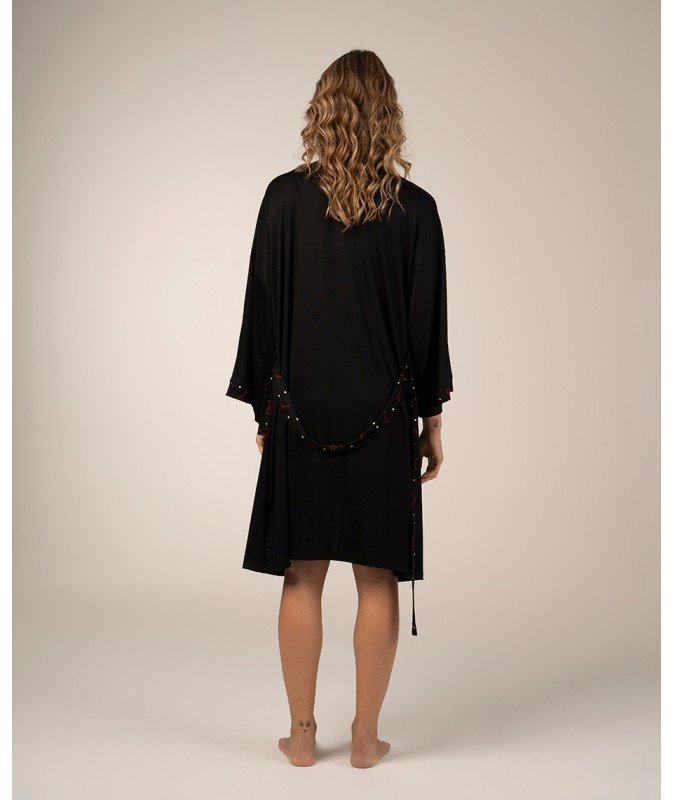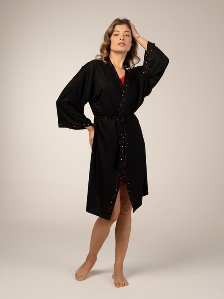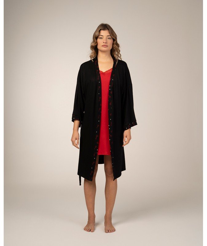 - Ogrtač je crne boje, sa suptilnim, ali elegantnim motivima crvenih srca, strelica i belih tačkica na ivicama i rukavima, koji dodaju dozu ženstvenosti i šarma.