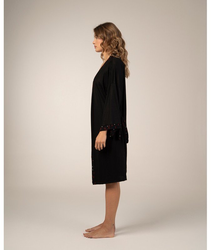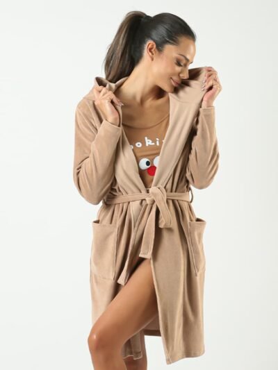 - Model je dužine ispod kolena, s udobnim 3/4 rukavima koji pružaju slobodu pokreta. Ogrtač ima kaiš za vezivanje u struku, omogućavajući prilagodbu figuri i dodatnu praktičnost. Tkanina je lagana, prozračna i idealna za svakodnevno nošenje ili trenutke opuštanja kod kuće.