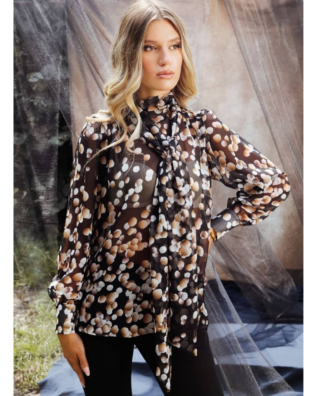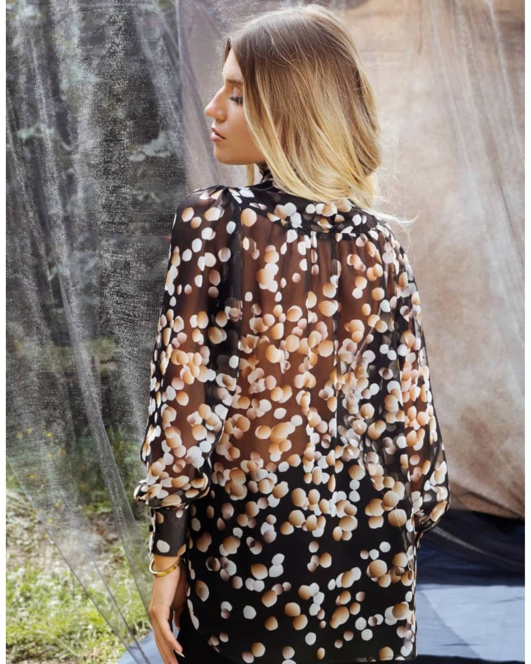 - Ženska šira tunika asimetrične dužine i sa naciganim leđima i prednjicom.Tunika ima šal kragnu sa mašnama za vezanje i nacigovane rukave sa mandžetama.