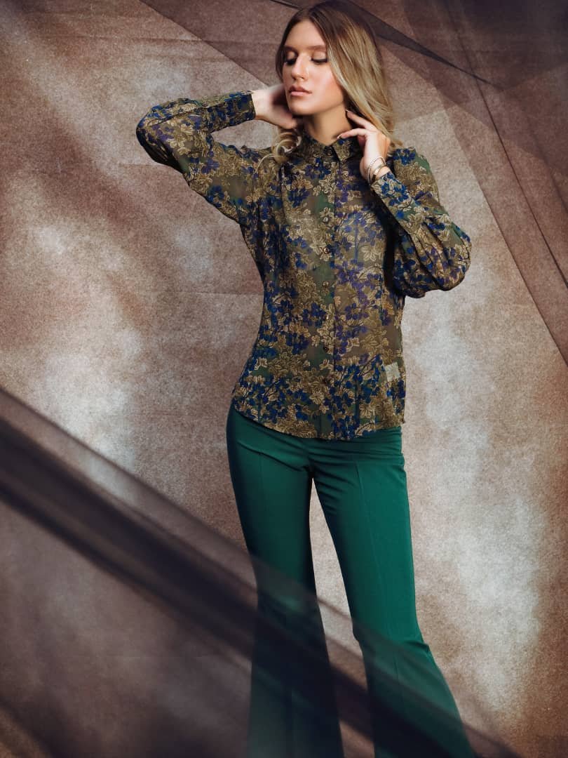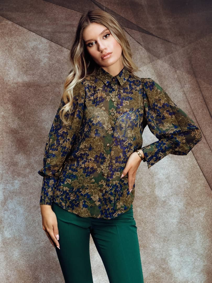 - Ženska blago strukirana bluza sa klasičnom kragnom i kopčanjem.Bluza ima nabrane rukave sa širokim mandžetama.