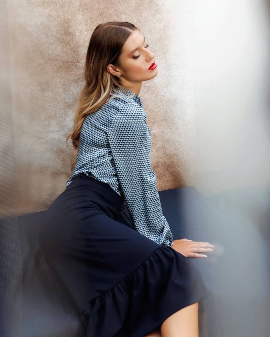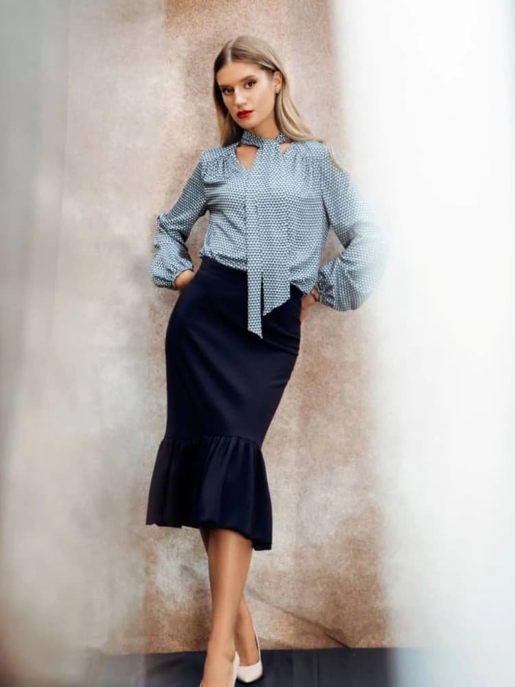 - Ženska bluza ravnog kroja sa nacigovanim ramenima na prednejm dijelu.Bluza je na V izrez ,ima mašne za vezanje i gumu u rukavima.
