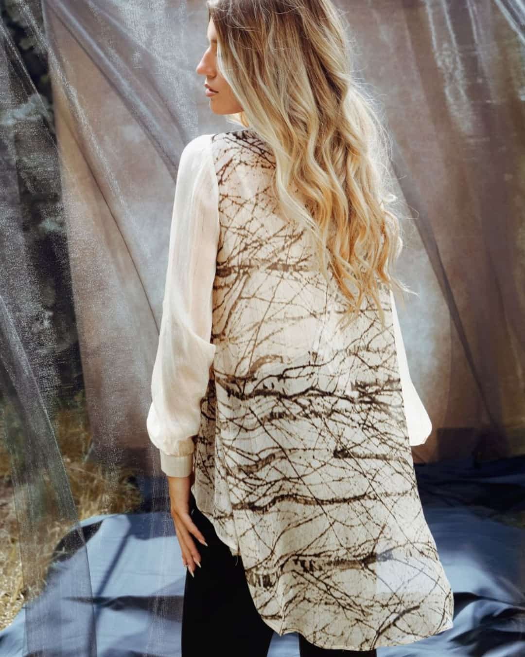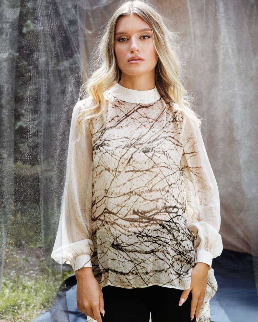 - Ženska tunika asimetrične dužine sa povišenom kragnom.Rukavi su nacigani sa mandžetama.Uz tuniku dođe top od viskoznog pletiva.