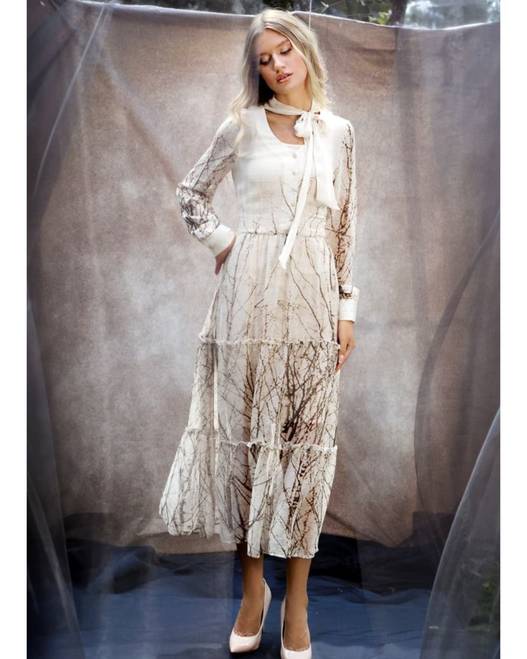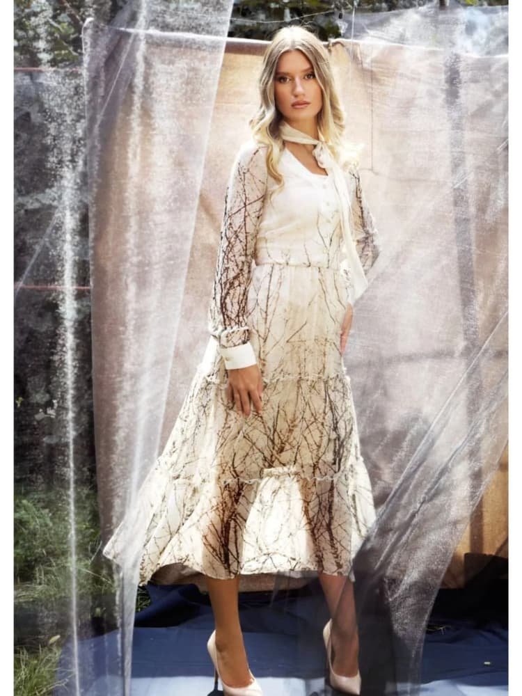 - Ženska haljina sa volanima na “V” i izrez sa mašnama za vezanje. Rukavi su klasični sa mandžetama. Uz haljinu dođe podhaljina od viskoznog pletiva.