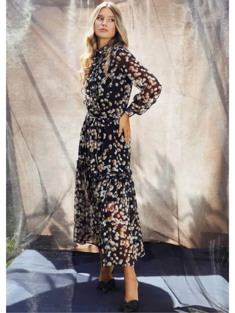 - Ženska haljina sa klasičnom kragnom i volanićima.Haljina ima gumu u struku i klasične rukave sa mandžetama.Uz haljinu dođe podhaljina od pamučnog pletiva.