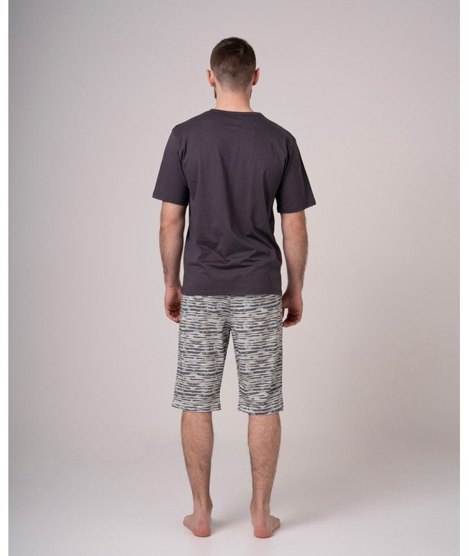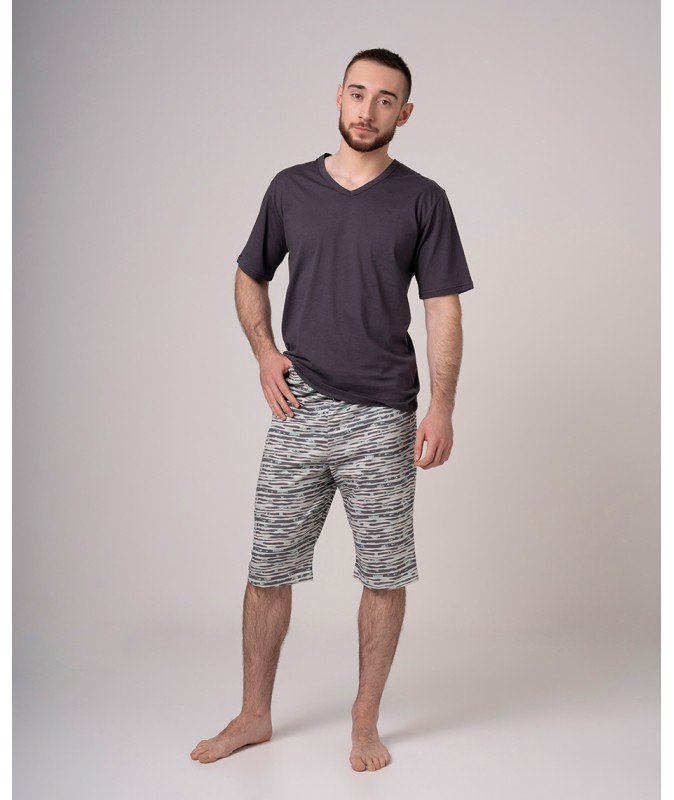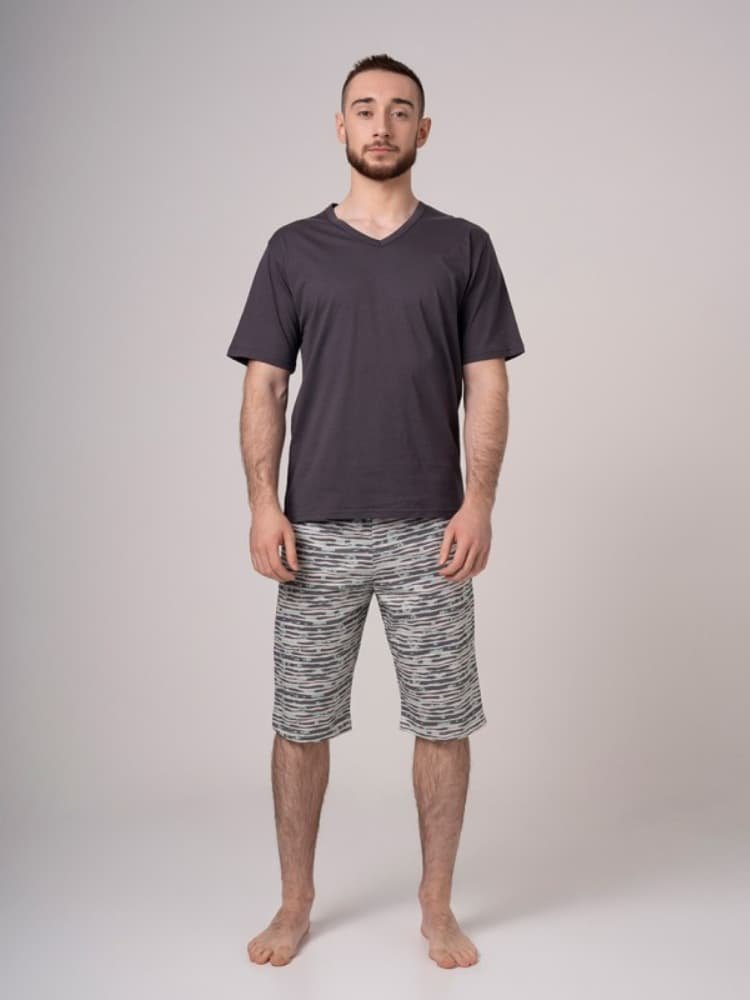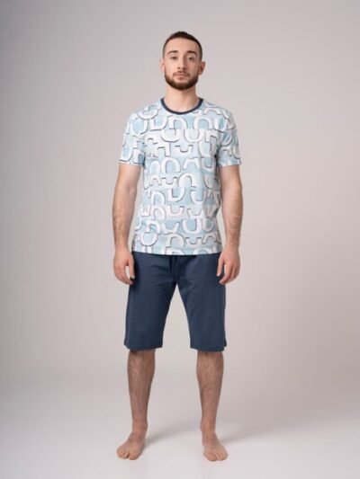 - Muška pidžama od pamuka koja osigurava maksimalnu udobnost i prozračnost tijekom cijele noći. Gornji dio u jednobojnoj varijanti dolazi sa V-izrezom i kratkim rukavima, pružajući klasičan i opušten izgled. Donji deo su bermude dužine do koljena sa elastičnim pojasom, u zanimljivom plavom printu koji dodaje modernu notu.
