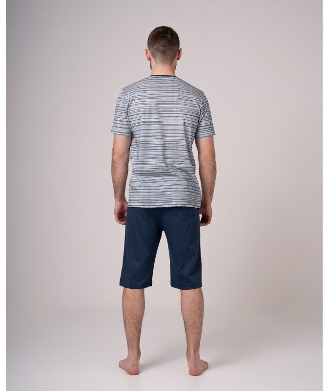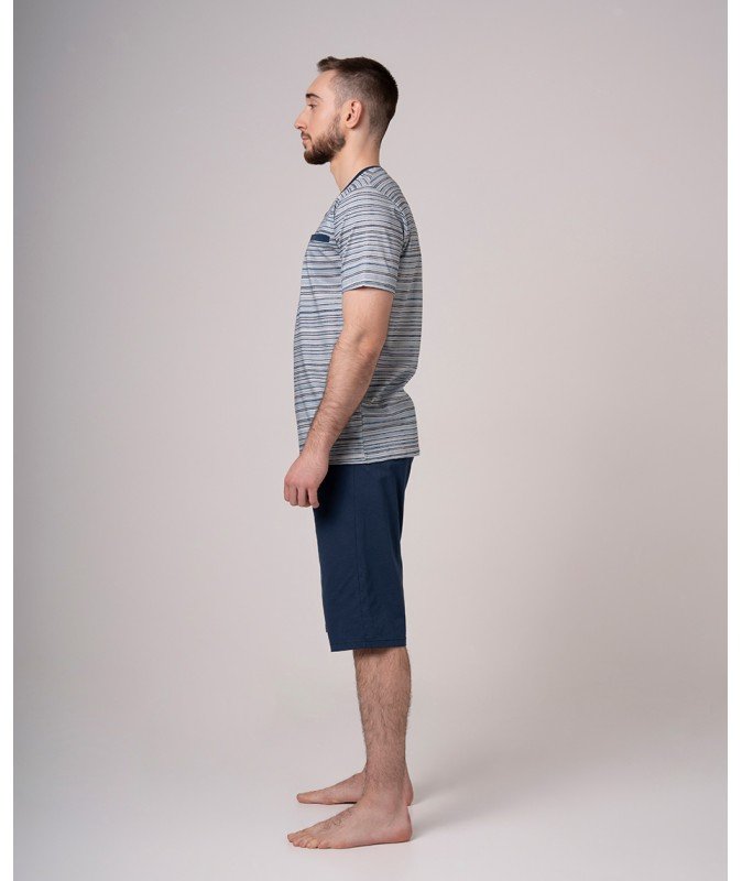 - Ljetna muška pidžama iz dva dijela od pamuka. Gornji dio je prugasta plava majica sa okruglim izrezom, kratkim rukavima, funkcionalnim džepom i tri dugmeta za raskopčavanje, pružajući praktičnost i prilagodljivost. Donji dio je šorts do koljena u teget plavoj boji, opremljen vezivnom trakom u struku, pružajući praktičnost i dodatnu funkcionalnost.