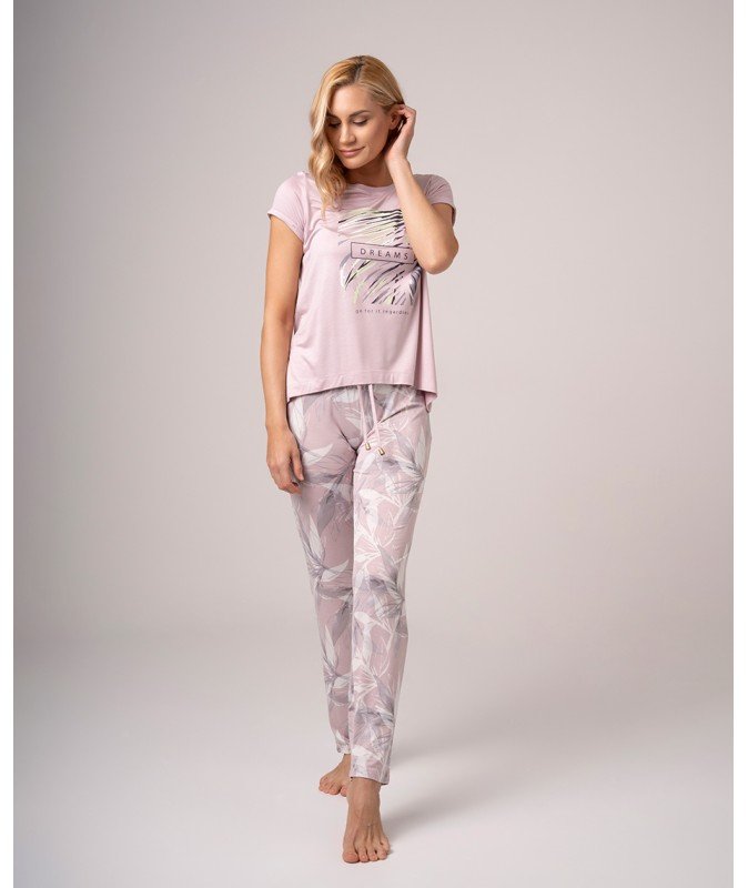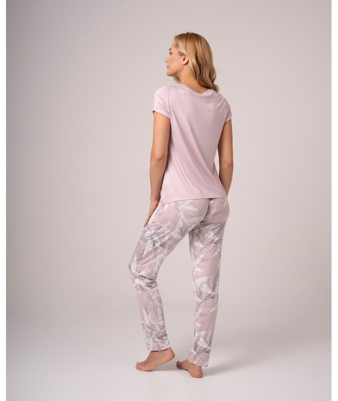 - Gornji dio u nježnoj lila nijansi ističe se modernim printom listova u zlatnim i crnim tonovima. Donji dio pidžame dolazi u opuštenom kroju sa dugim nogavicama i floralnim printom u nježnim, pastelno sivim i lila tonovima.