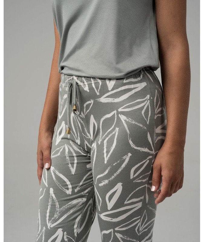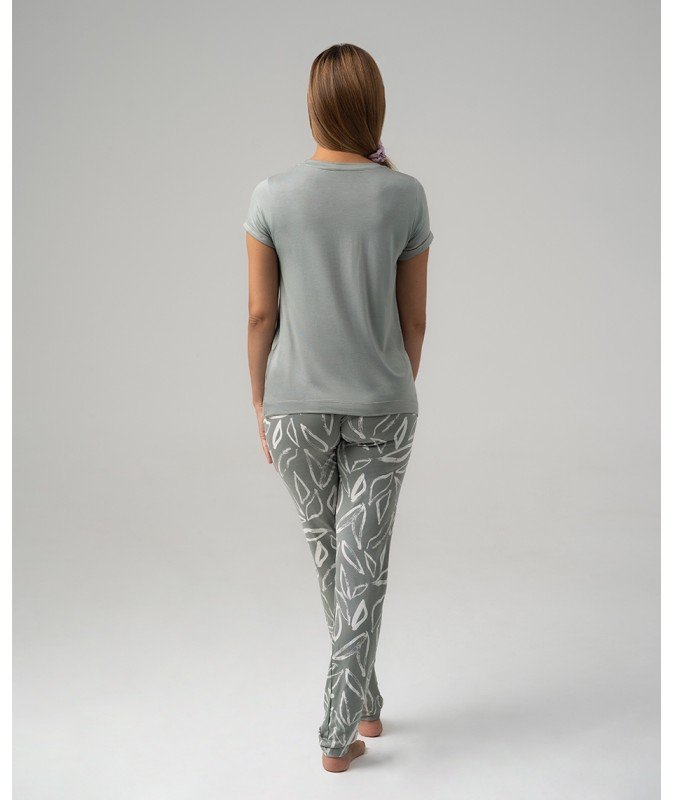 - Gornji dio je u pastelno zelenoj boji s kratkim rukavima i okruglim okovratnikom koji dodaju klasičan i sofisticiran izgled. Donji dio pidžame je pastelno zelene boje sa bijelim detaljima, sa dugim nogavicama koje ravno padaju za dodatnu udobnost. Vezivna trakica u struku omogućava savršeno prilagođavanje i udoban fit.