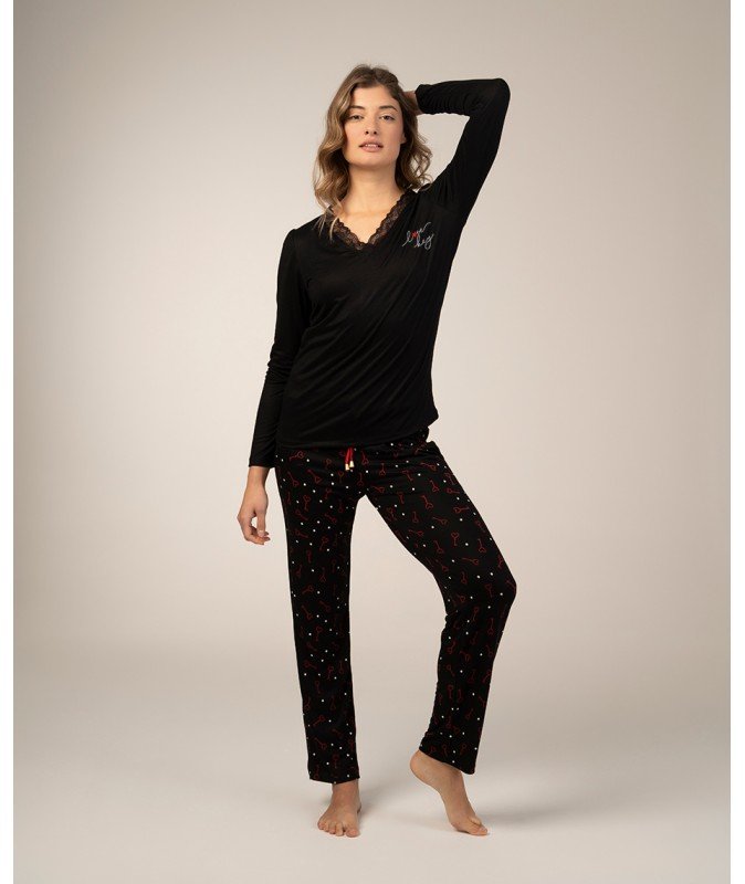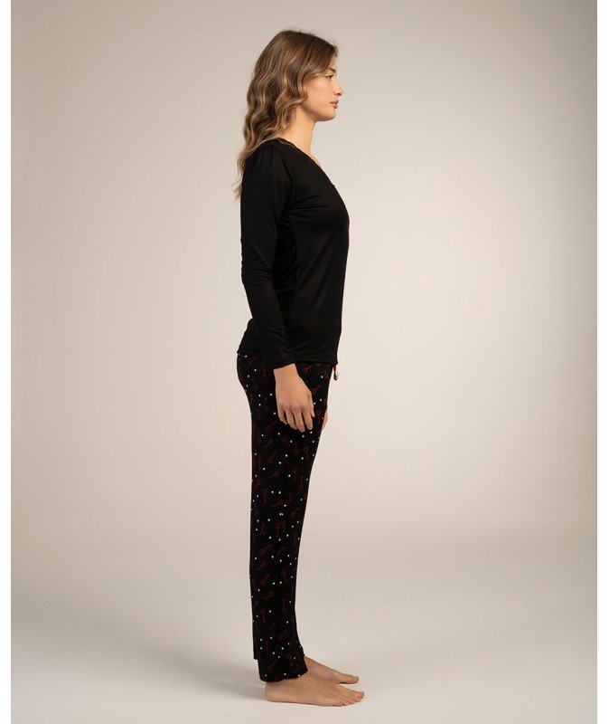 - Gornji dio pidžame dolazi u crnoj boji, sa dugim rukavima i V-izrezom ukrašenim delikatnom čipkom. Donji dio ima crvenu trakicu za vezivanje u struku, koja pruža mogućnost prilagođavanja i dodatnu udobnost.