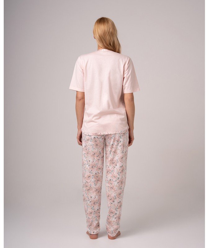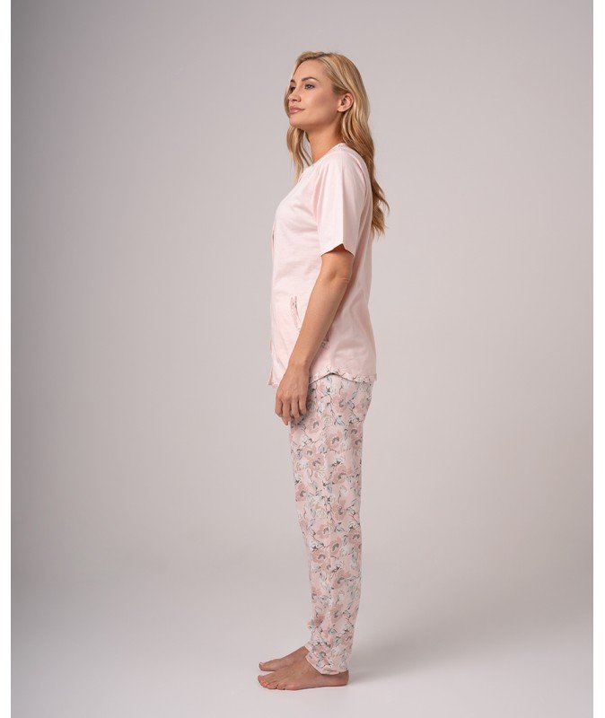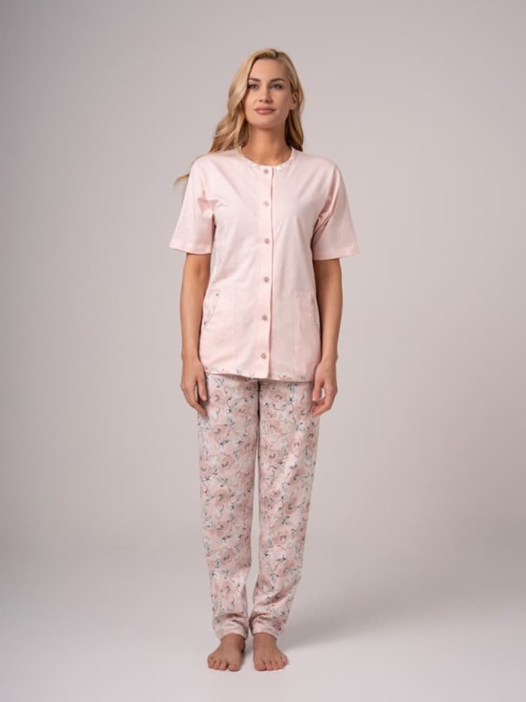 - Gornji dio u nježno rozoj boji ima kratke rukave i kopčanje duž cijele dužine. Donji dio je u istom tonu, ali ukrašen floralnim printom, u ravnom kroju sa puno slobode pokreta.