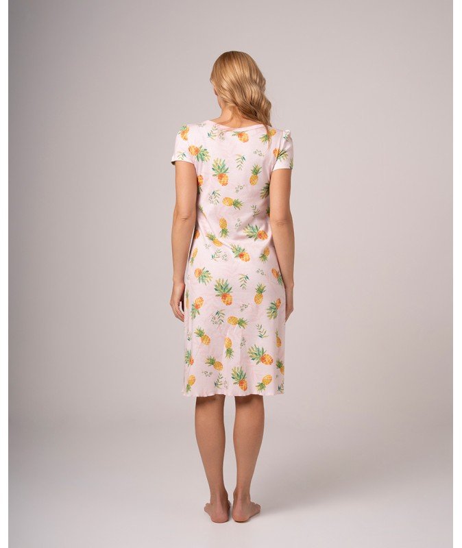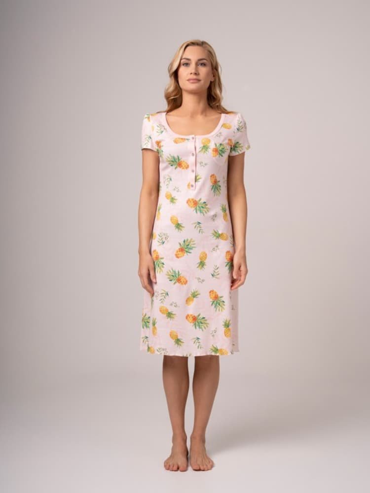 - Ova nježna ženska spavaćica u pastelno rozoj boji unosi dozu razigranosti i svježine u vaše večernje trenutke. Prekrivena šarmantnim printom ananasa i zelenih listova, donosi tropski duh u vašu svakodnevicu.
